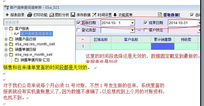 可实际应用中,我们需要和客户供应商对账,有时月初的时候需要知道上个月月底的销售和往来真实情况,可是现在系统无法实现,必须得每个月最后一天统计数据备份到excel里,有客户来对账,系统也不能查询上个月月底的具体情况。。请老师关注这里的时间段限定,非常感谢!!