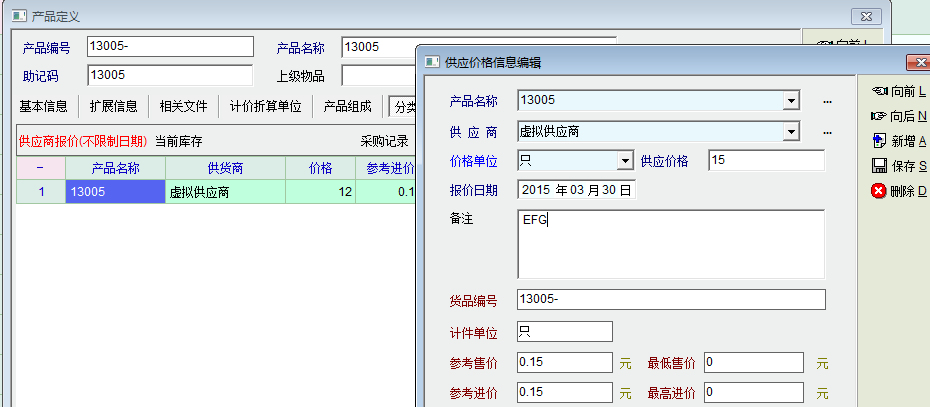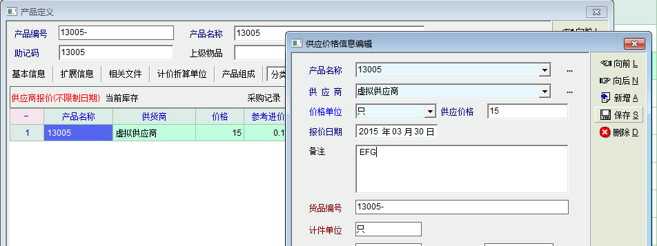 如图片所示,产品13005已经有了虚拟供应商的一个报价,单价是12,备注内容为ABC,现在想增加一条报价,单价是15,备注内容是EFG,点击新增,输入内容,保存后,系统只剩下最新的记录,原来的报价记录就没有了