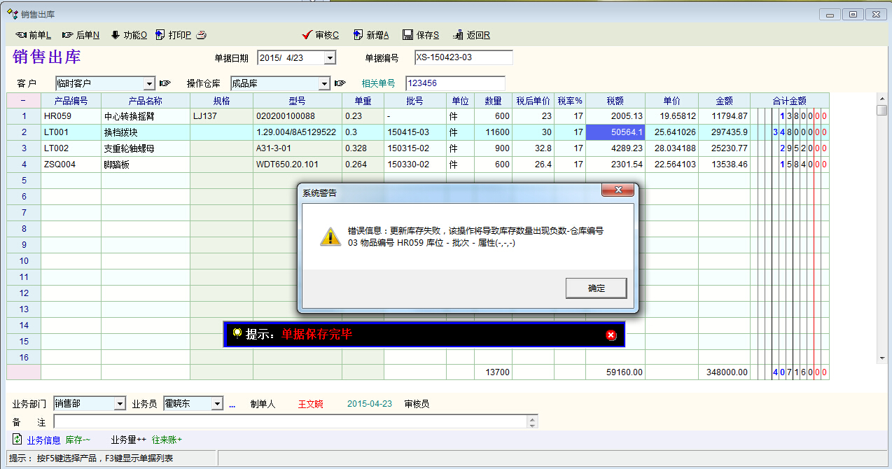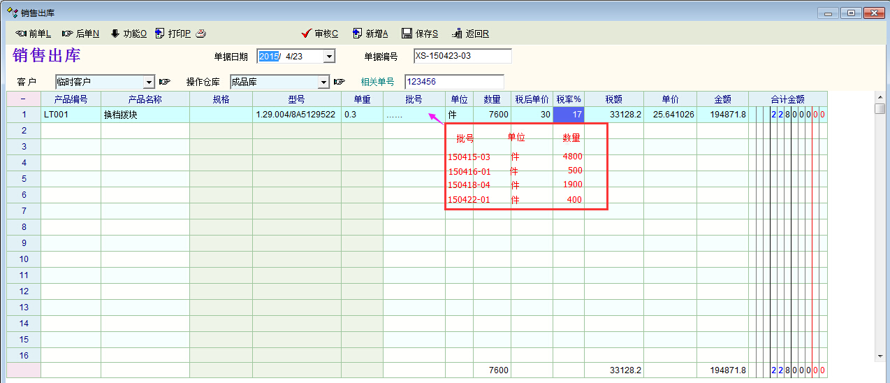 当物资分批次管理时,单据中就经常会出现一种物资对应多个批次的情况,下面以销售出库单据为例说明一下: