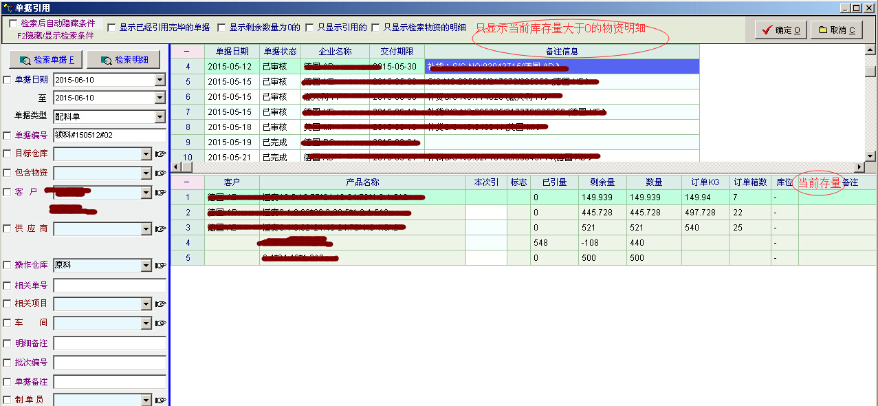 这个是基本的生产流程的东西,不知道你上面的这个“配料单”是什么意思?也不知道你现在这个单据是什么,引用的上级单据是什么意思,如果只是生产领料,直接在领料单就可以看到了当前库存了。 感觉你那里就是管理流程的问题,不是软件的问题。 |