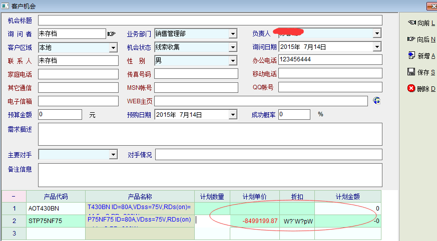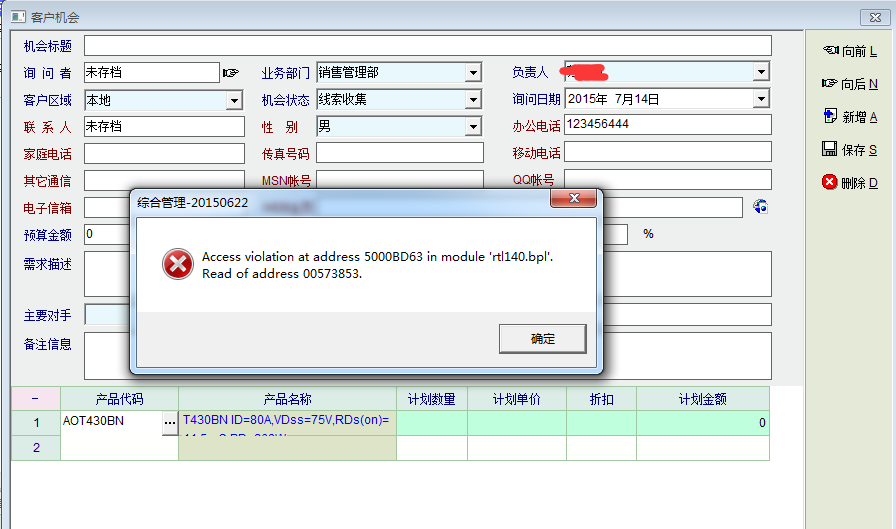 如图,客户机会中,在产品代码单元中从系统选择产品并确认后,系统提示出错。