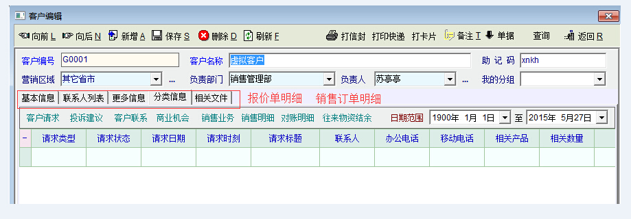 如图,如何通过脚本在客户编辑界面中添加类似分类信息中的销售明细等的自定义报表,或者说如何将报价单明细报表添加到客户编辑页面中呢?