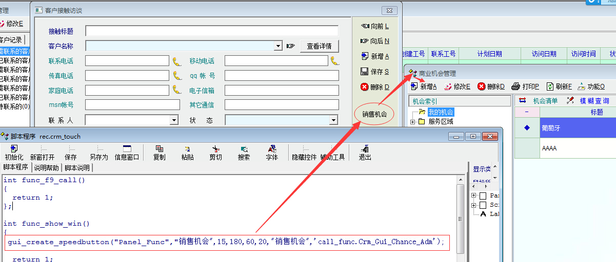 如图1,通过执行红色框内的脚本gui_create_speedbutton("Panel_Func","销售机会",15,180,60,20,"销售机会",'call_func.Crm_Gui_Chance_Adm');