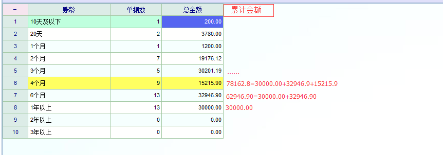 如图,建议在账龄统计报表中再添加一个累计金额统计列,这样,对总体的账龄统计、掌控就更加简明了。