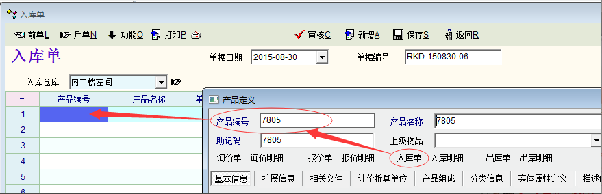 如图,请教一下老师们,如何通过脚本将产品定义中的产品编号传递到入库单中呢?也就是说,在打开入库单的时候,自动把当前产品编号输入到入库单的明细中呢?