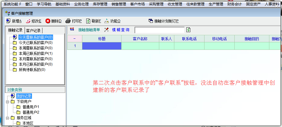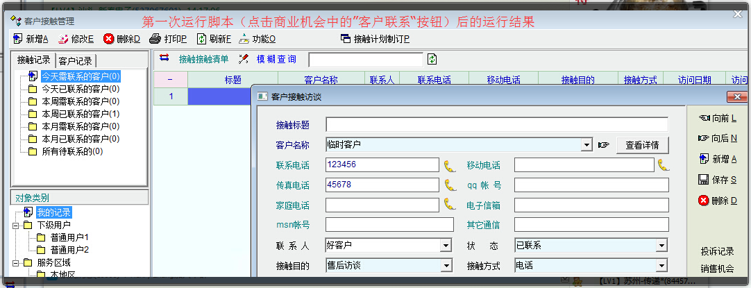 在商业机会中运行如下脚本: int func_show_win() { //run_csp_line,表示点击的时候执行这句脚本 string begin_date; gui_create_speedbutton("Panel_Func","客户联系",15,230,60,20,"客户联系","call_csp.rec.crm_chance.main1"); gui_create_speedbutton("Panel_Func","投诉记录",15,255,60,20,"投诉记录","call_csp.rec.crm_chance.main2"); ...... int main1() { string khm,khid,sql; khm=gui_get_val("Edit_Eba_Name");//获取客户名 sql="select eba_id from eba where eba_name = '"+khm+"'";//通过客户查询客户编码 db_run(sql); //通过客户查询客户编码 khid=db_res(0);//将查询结果(0表示查询到的第一个字段)赋值给khid. call_dll_func("crm_app","Crm_Gui_Touch_Adm"); change_to_win("客户接触管理==TForm_Touch_Adm"); gui_trigger_click("SpeedButton_Create"); gui_set_val("ComboBox_Ext_Eba_Id",khid); gui_trigger_change("ComboBox_Ext_Eba_Id"); return 1; }; int main2() { string khm,khid,sql; khm=gui_get_val("Edit_Eba_Name");//获取客户名 sql="select eba_id from eba where eba_name = '"+khm+"'";//通过客户查询客户编码 db_run(sql); //通过客户查询客户编码 khid=db_res(0);//将查询结果(0表示查询到的第一个字段)赋值给khid. call_dll_func("crm_app","Crm_Gui_Event_Adm"); change_to_win("客户事件-投诉建议管理==TForm_Event_Adm"); gui_trigger_click("SpeedButton_Create"); gui_set_val("ComboBox_Ext_Eba_Id",khid); gui_trigger_change("ComboBox_Ext_Eba_Id"); return 1; }; 脚本运行后,第一次点击客户联系或投诉记录,可以正确的新建客户联系或投诉记录。但如果再次点击创建的“客户联系”或“投诉记录” 按钮,运行脚本后,就没法新建“客户联系”记录或“投诉记录”了。 |