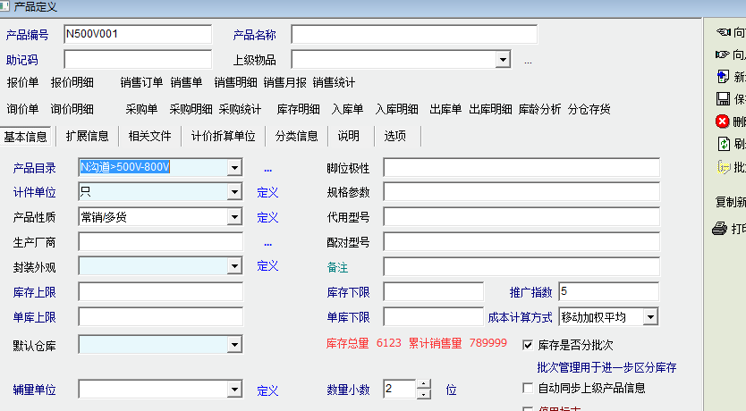 在产品定义的基本信息中显示产品的库存总量与销售总量这两个内容,这样,当打开产品的产品定义,想了解产品概况时,就不用去切换到分类信息,再点击打开分类信息中的当前库存及销售记录了,不但节约了时间,也提高了系统效率(尤其是当库存明细及销售记录比较多的时候可以避免提取数据时的卡顿)。