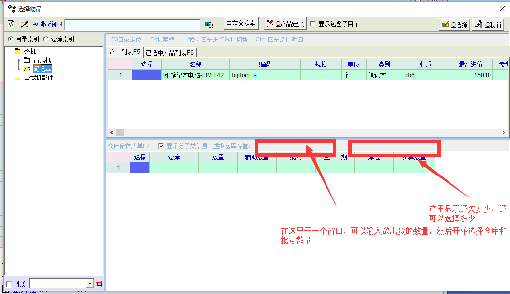 参考某些软件的方法,我先选定了物资,然后输入准备出货的数量10,然后我开始点选,ABC,到C这里数量已经够10个了,点到D的时候它就会有提示,变颜色或者数量提示,我点击确定,回到单据界面,A2  B5  C原本有8个,他只会自动输入3个,凑够欲出货的10个数。