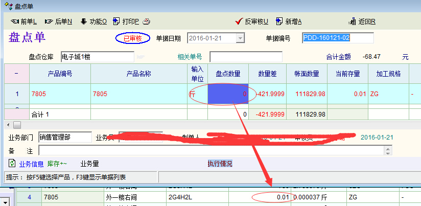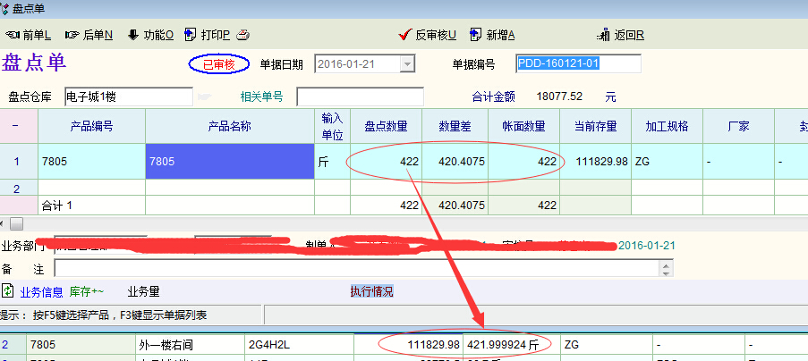 如图,盘点的数量是整数422斤(折算单位),但在库存清单查询中的折算数量却显示成了小数421.999924斤,存在一定的误差。想请教产生的原因并请老师改进。
