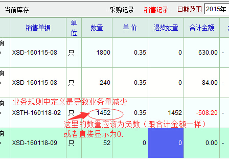 如图,销售退货单中,业务规则中定义是导致业务量减少。但在销售统计中,退货数量仍然加在销售量中,明显有误,建议更正。退货的数量应该显示为负数才对。或者也可以只显示退货数量而不显示数量。