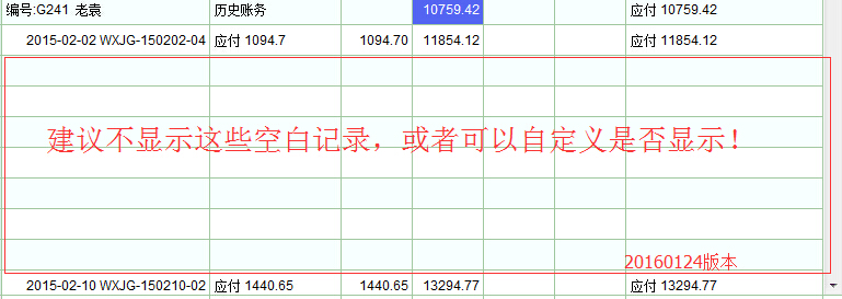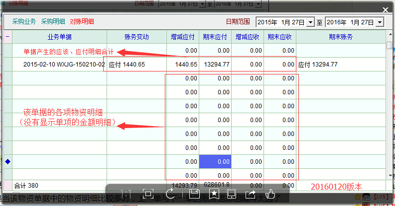 20160120版本的对账单怎么现在出现了许多空记录,严重影响对整体账务的查阅。经分析,是系统在对账单中把产生应收、应付的物资单据的物资明细都显示到对账明细中了。估计版主的本意应该是更具体、详细的显示出账务,但实际运用起来却是非常的不方便,想查看对账明细概况,有时变得相当的困难:尤其是当该物资单据中的物资明细比较多时,上一单与下一单的账务信息相隔得太远了。对账一般以整张单的账务往来做核对,有错误或出入时才查看单据的明细内容。建议恢复原来的对账单格式。或者当应收、应付等账务明细都为空时,隐藏空记录。