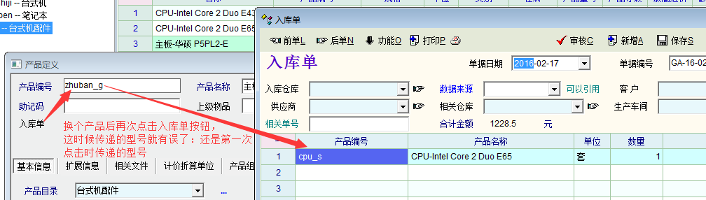 第一次点击传递,一切正常。但换个产品,再次点击入库单按钮,这时候入库单中的产品明细就不正确了:还是原来第一次点击时传递的产品。