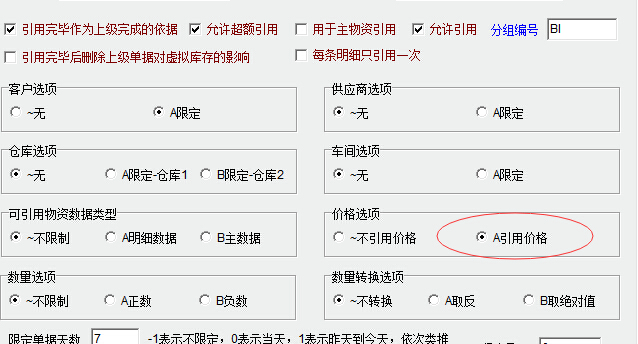 运用这个脚本时,如果引用的A列是产品单价的话,要记得将业务设置中的单据引用参数设置中将“引用价格”选上,否则脚本就会失效出错。 |
