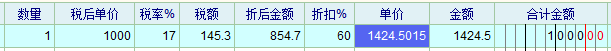 数量  税后单价  税率%  税额  折后金额  折扣%  单价  金额  合计