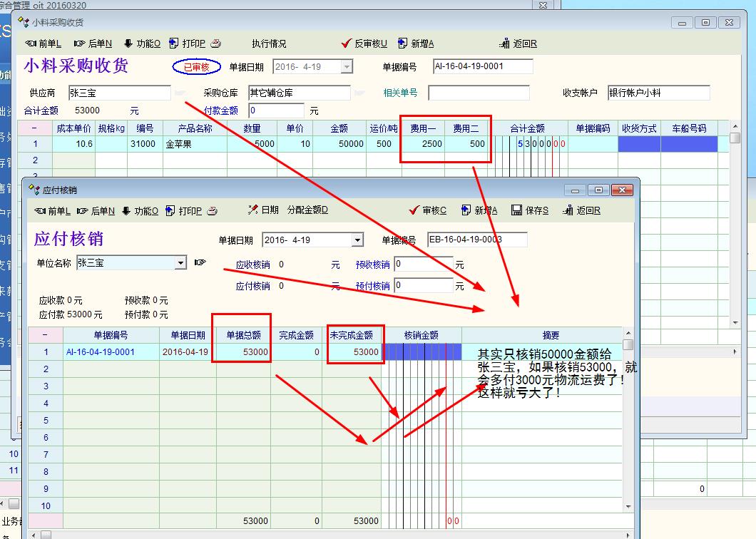 问题一,建议在采购管理与销售管理增加单独录入费用核算! 个人认为: 因为很多时候采购与销售的物流费用是单独支付的,虽然现在有费用一与费用二可以添加,但是在应付核销的时候会把本来属于运费的金额多支付给供应商与客户这是不方便的,虽然应付的时候可以不支付运费部分可是这样会核销不完全! 方法1: 把采购管理与销售管理的金额与费用独立分开。 方法2:在采购与销售时只添加品种的金额不添加数量,OIT是不会自动运算的,如果可以直接增加金额也会运算,也是一种解决方法, 方法3:在核销的时候可以选择性的支付金额与费用一,费用二, 方法4:把采购管理与销售管理的金额与费用一,二独立一些,同时在核销的时候可以选择性的支付金额与费用,这样最完美!!! ------------------------------------------------------ 问题二, 有时候有些小数是扣除的, 付不完全, 能不能在收付款那里增加引用完成标志,就好像单据上下级引用一样,!! --------------------------------------------------------------- 问题三, 在付款单明细下面右键菜单,有个功能项要改动一下,如果 清账核销的时候,只核销部份单据时,点击 隐藏操作金额为0的明细后,再点清账核销,就会把已经隐藏为0的单据也核销在里面.能不能右键菜单增加一项: 删除操作金额为0的明细,这样就核销就不会把已经隐藏的单据连在一起核销!! 问题如下图: |