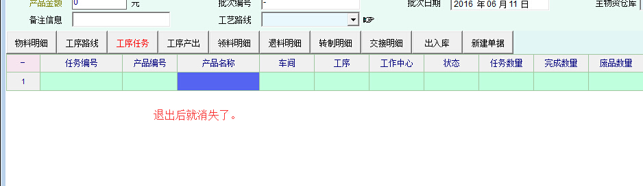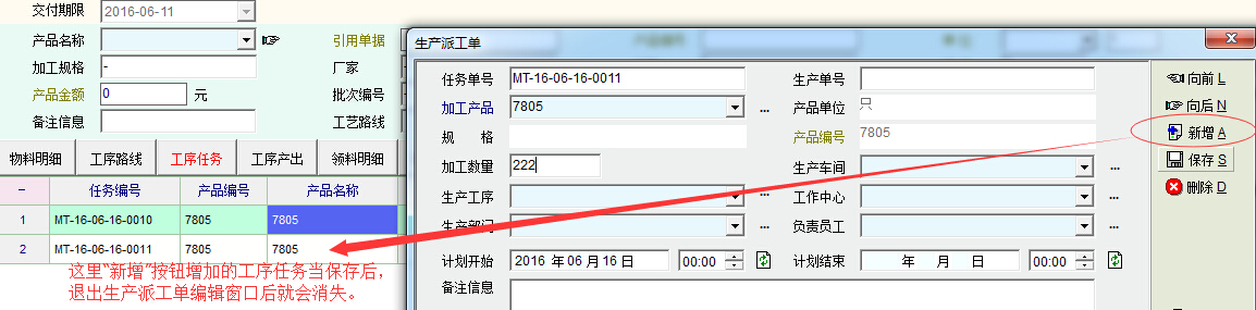 并没有删除任何单号。只要是在生产派工单窗口中点击新增按钮,填写相关内容保存后退出,原来在生产单中工序任务列表中出现的(刚刚新增的)生产派工单就不见了。