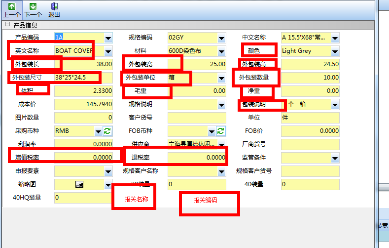老师,我们是贸易企业,涉及到出口报关,报关数据中对外包装的体积、毛利、报关名称之类的数据很重要的,而且会被出货明细调用,现在的产品信息字段不够用的,即使扩展了现有的8个也不够用,而且这些字段工厂也会用的到,如果这些工厂跟外贸公司在合作 ,外贸公司会要求工厂提供这些数据的,详细如附件中图所示(红框内),这个目前我们公司在着手编产品资料了,我们是打算表格导入的方式去追加初始产品信息,希望能在6.20前实现这些功能,拜托了。
