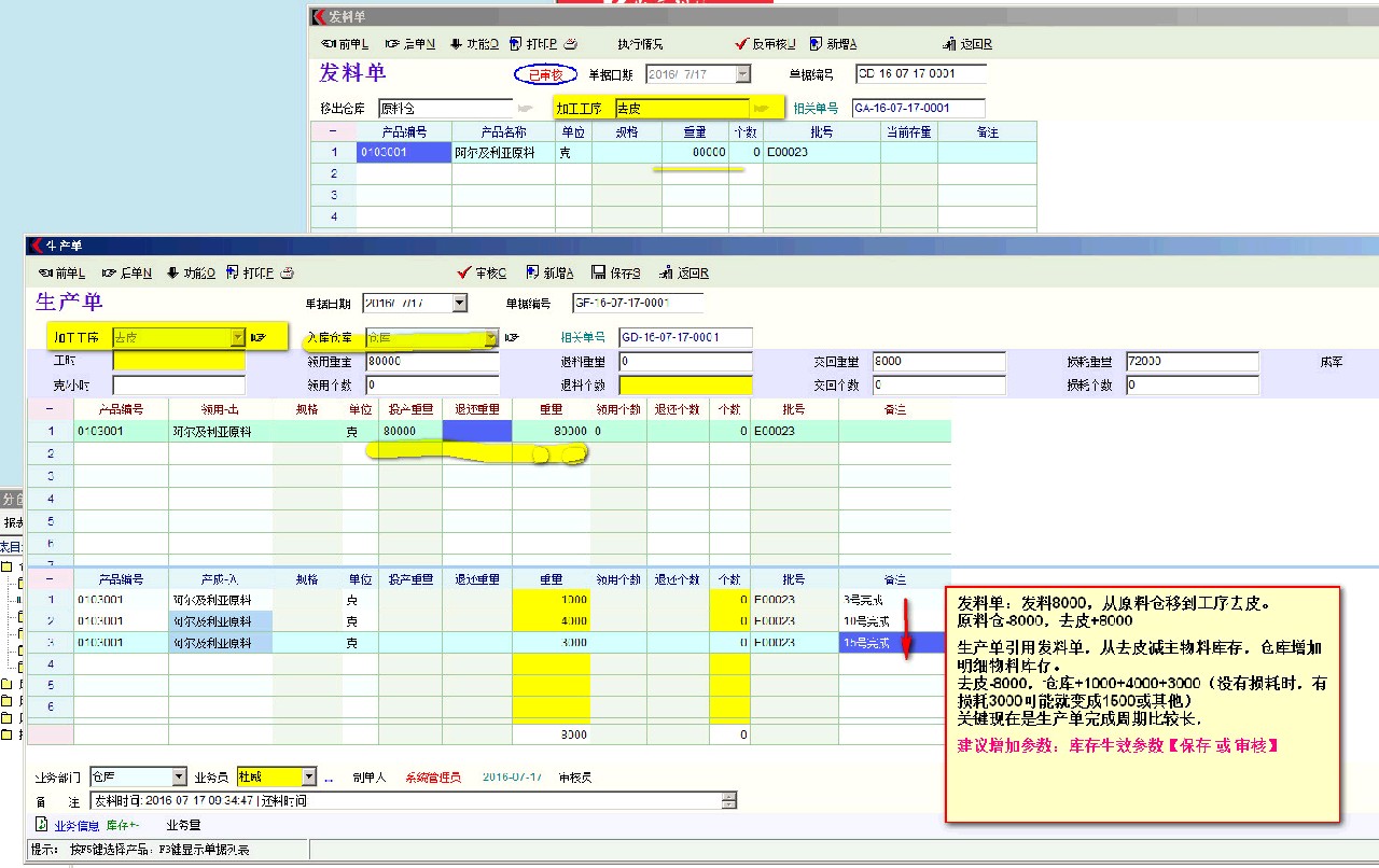 车间现场仓的概念其实就是:以车间的名义起的仓库名称,就想象在车间的角落里设定了一个地方存放物资,也许这个角落其实是不存在的,也许这个角落就是在流水线上。 首先解决的是一些无法分割的BOM物资,比如说油漆,某个订单可能需要1公斤油漆,但是仓库无法倒1公斤油漆给车间使用,只能采用调拨的方式把一大桶油漆先调拨到车间中,车间生产完成以后,多余的退回给仓库中,使用的按实际生产耗用进行成本费用分摊。 杨老师的问题也可以用车间仓库来解决,原材料首先从原材料仓库出仓(生产领料单),经过第一道工序,A车间仓库入库半成品,然后第二道工序从A车间仓库领料生产(物料交接单),物料交接单审核就会从A车间仓库到B车间仓库。无论是不是有损耗,物料经过一道工序,已经不同于第一道工序的物料了,已经是新的一个物料编码了,成本核算来说也是没有问题的。到最后一道工序完成,就是引用生产任务单成品入仓(成品入仓单)了。一条生产流程下来,如果按订单领料生产,车间仓库中理论是没有任何剩余。 生产领料单对应的是从仓库领料,物料交接单对应的是车间之间的流转。 想要查看生产过程,一查工序路线中的工序产出,二查车间仓库中的现有库存,无论一张生产任务单做成一百年也好,都没有影响的。 |