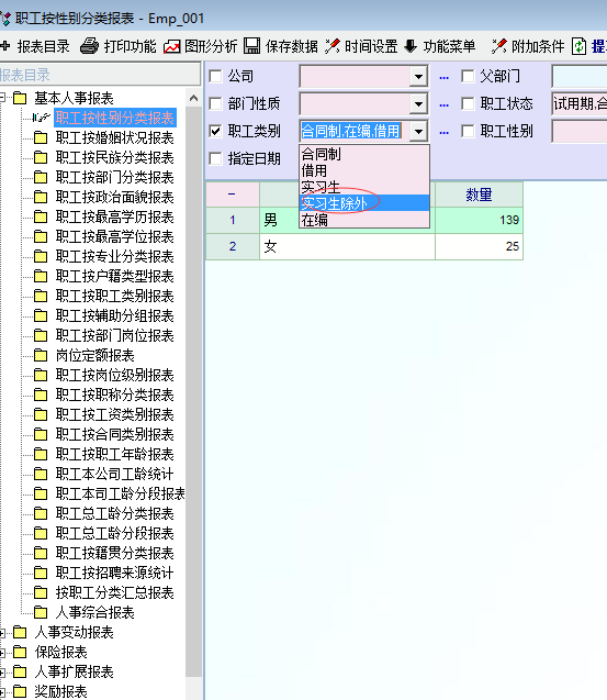 1、人事综合报表(统计人数是按 非离职退休状态 员工统计的,也就是将实习生 也计算在内了,这样就影响了计算的结果)