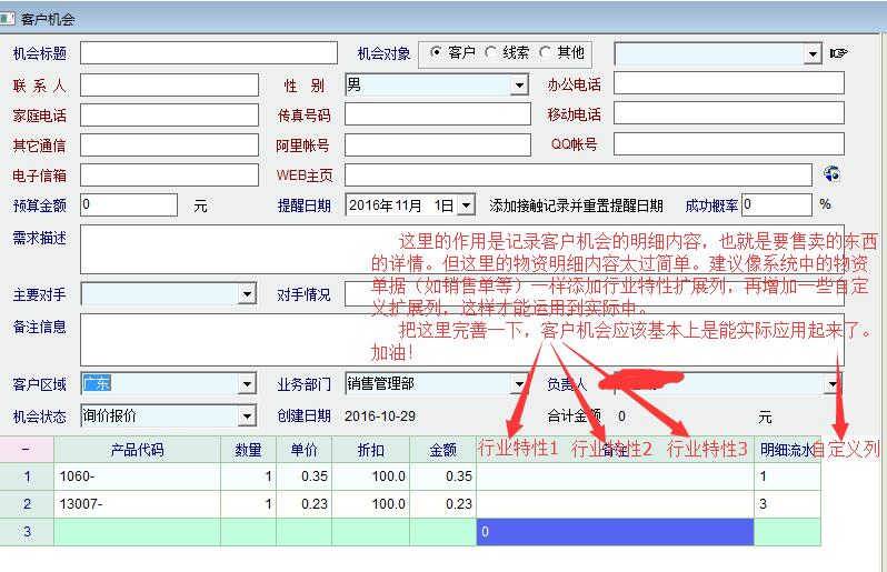 客户机会中的物资明细记录的是要销售的产品的明细,作用应该是跟系统中的其它物资单据,如销售订单,销售发货单一样。作用一样,记录的产品内容应该也是差不多才对。但现在的客户机会中物资明细的内容却太过简单:没有“产品行业特性”扩展列,没有“自定义”列,没有“批号”列,甚至连“产品单位”列都没有,根本没法满足实际使用中的要求。强烈建议老师能添加这几项内容!