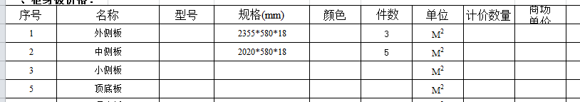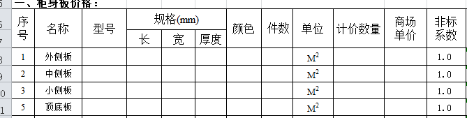这样的表格可以用在家具行业的单件标准成本计算,也可以用到销售对外报价表上,都是以平方米为单位计算的。