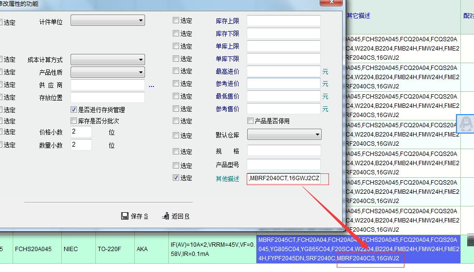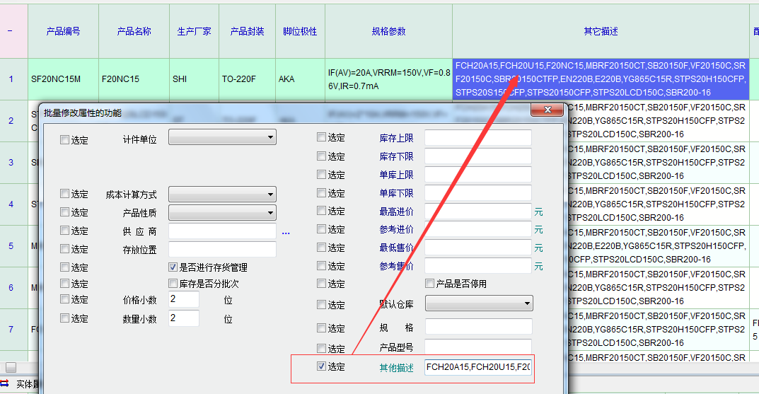 产品定义中的右键菜单功能:批量修改界面上记录属性中的其他描述项在使用过程中发现,只要内容比较长(图1),如具体批量修改文本为:FCH20A15,FCH20U15,F20NC15,MBRF20150CT,SB20150F,VF20150C,SRF20150C,SBR20150CTFP,EN220B,E220B,YG865C15R,STPS20H150CFP,STPS20S150CFP,STPS20150CFP,STPS20LCD150C,SBR200-16,则管理系统在保存修改过程中会自动死机(图2)。