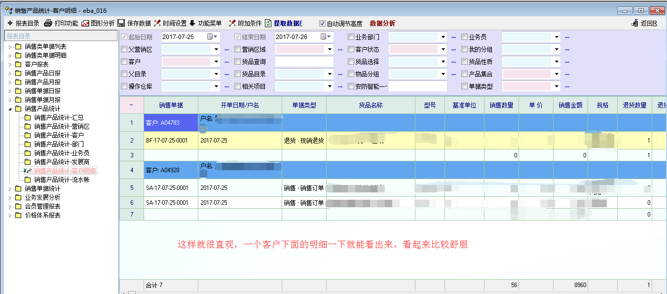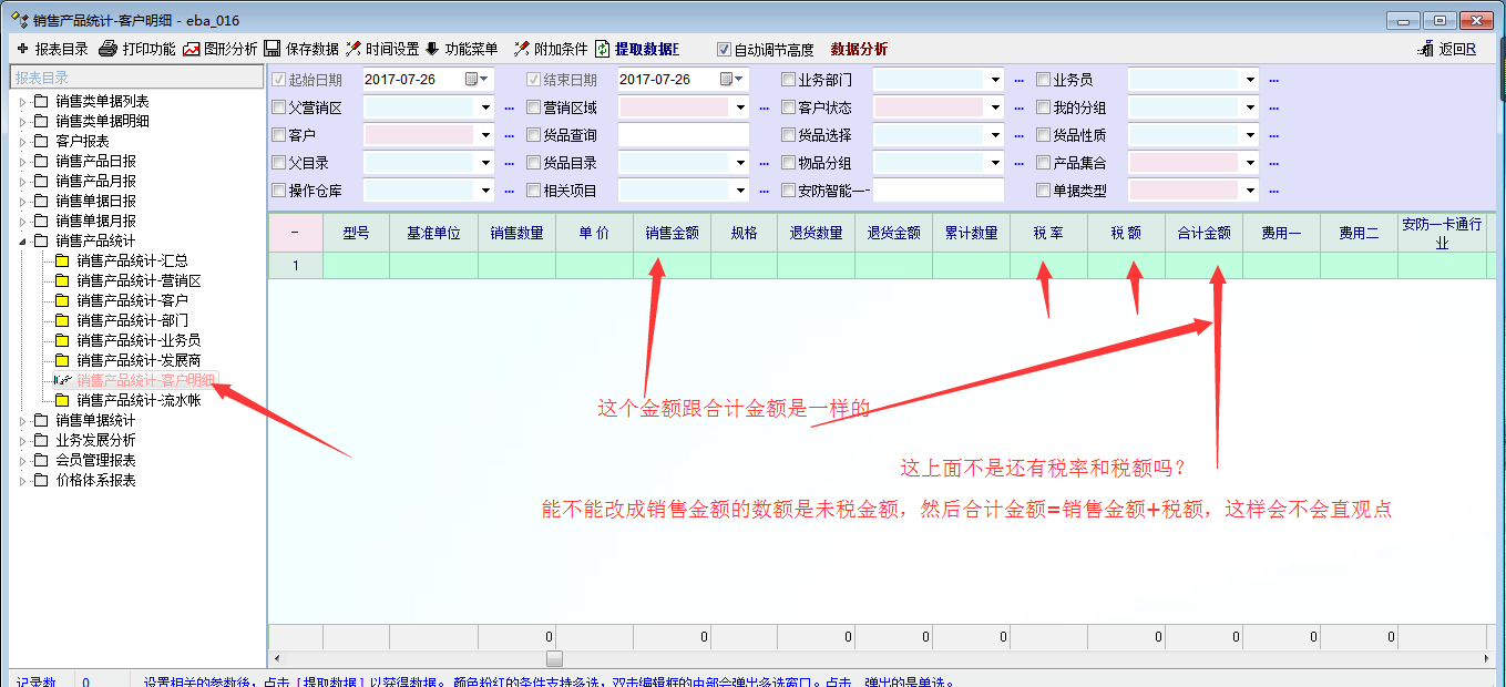 “销售产品统计-客户明细”对于需要统计销售额的话很方便,之前问过老师在“销售类单据明细”可以查不含税的销售金额,但是这个不像客户明细里面的直观,所以项请问下能否修改一下?