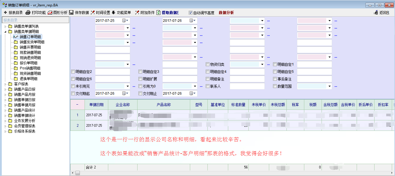 或者把“销售类单据明细-销售订单明细”的格式改成“销售产品统计-客户明细”那样的显示格式!显示格式改变而已,计算方法还是按照“销售类单据明细-销售订单明细”方法。