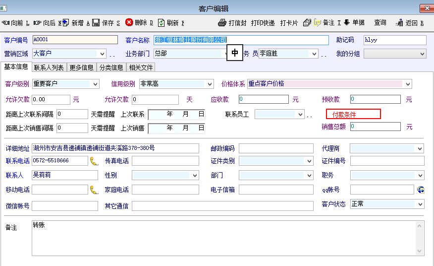 但是,我们现在的情况是,一个客户一个结算方式是固定的,比如现金或者转账;而且结算条件,日结、月结、20天结,也是固定的。所以,最好在客户资料新建的时候,就做一个选择,然后订单创建的时候,直接带入到销售订单的界面,不用在选择了,这样更方便。