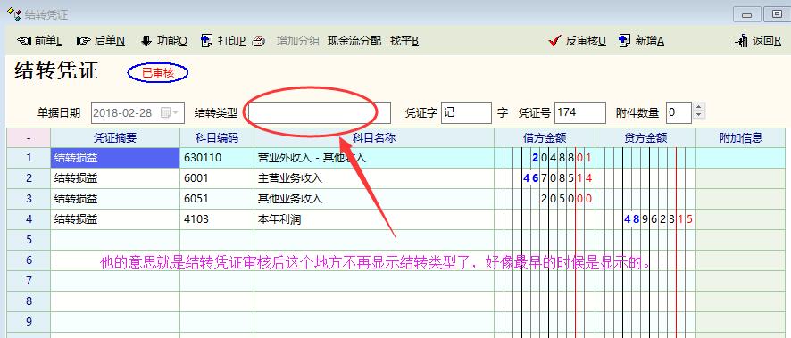 结转凭证审核后不再显示结转类型,这个问题我没有重现,是不是改了结转配置里的编号?