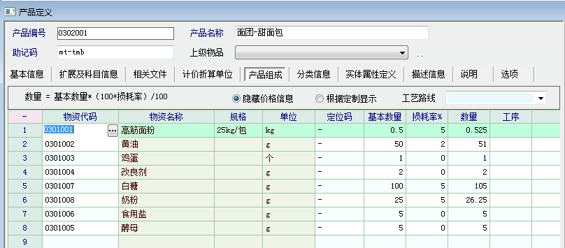 首先我在商品中将《披萨(成品)》的产品组成定义为《面团(半成品)》。将《面团》的产品组成定义为其它多种源材料,如图: