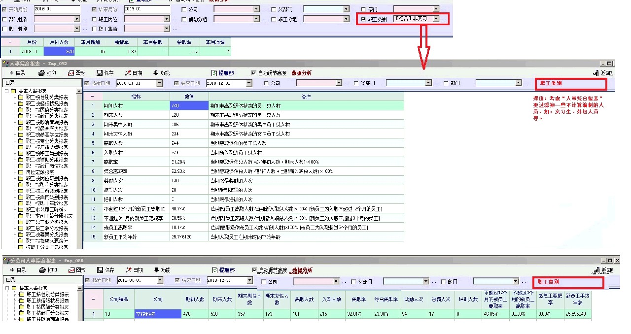 考虑“人事综合报表”、“分公司人事综合报表报表”统计是,需要过滤掉一些不算编制的人员,如实习生、挂靠人员,建议增加“职工类别”,并调整显示计算规则。