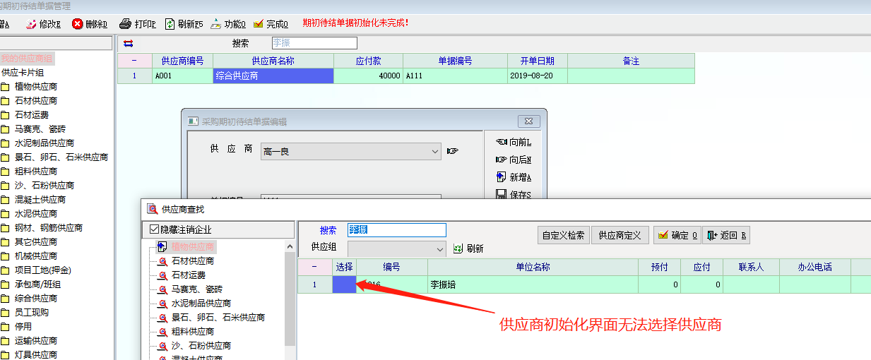 求助_供应商预付账款初始化界面,无法选择供应商_产供销