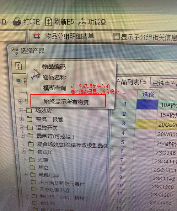发现只要需要选择输入产品,出现选择产品窗口都会出现这个问题。问题应该是始终显示所有产品的选项失效。实际操作中勾不勾选都是显示所有产品