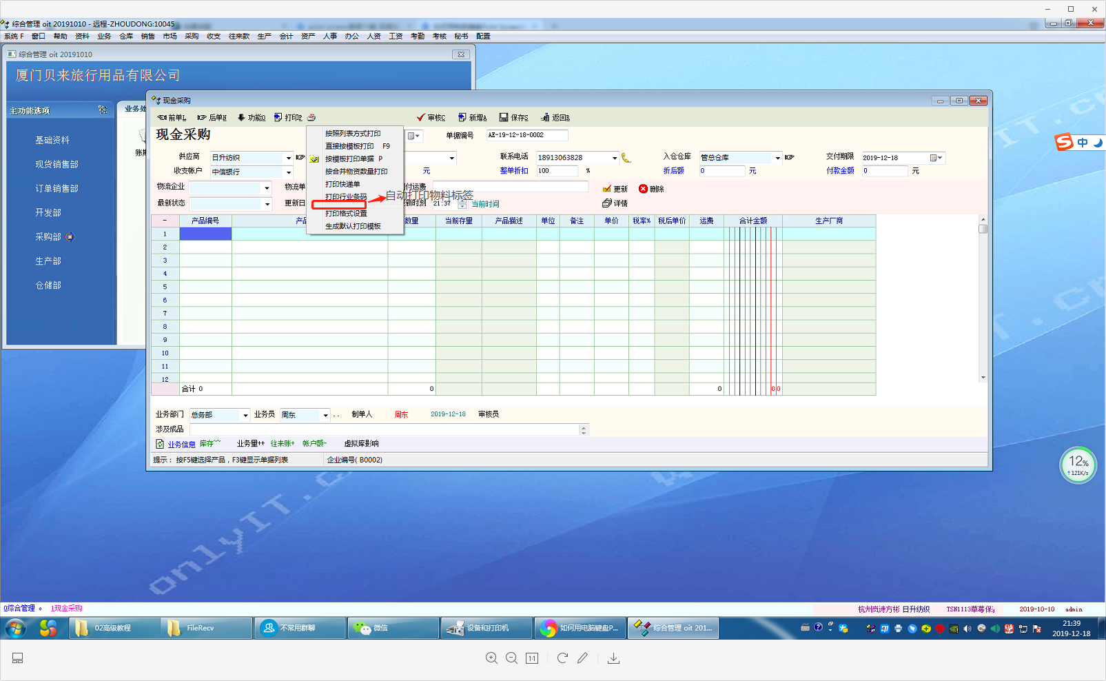 1,采购部创建采购订单--选择打印模板1(打印采购单发给供应商和仓库收料人员)--单据上有个功能按钮【打印物料标签】【打印采购物资的条码标签,我们要提前打好条码标签交给仓库收货的人员,因为有很多材料我们要到物流点去自提,打印条码标签最好是能够在oti软件打印,这样我们能少安装软件,oit打印的时候会根据物资的折算数量,比如我采购1030码面料=20支30Y,这个20(自动换算成21)来决定打印物料标签的数量,在物料标签上面除了打印品名、编号(我们把编号做条码),还要打印本采购单的单号,以及默认送往的仓库名字】
