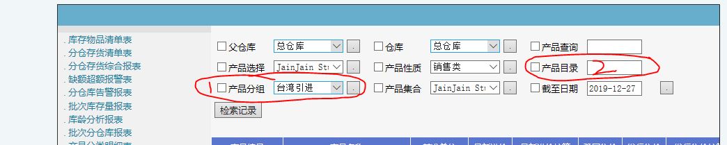 1、在产品资料管理模块中,我们设置了目录,并且在软件中,库存报表模块中可以通过下拉产品目录进行提取检索。但是在网页端,以及手机端,同样的产品目录查询中,却无法下拉,甚至填入文字也无法提取检索。