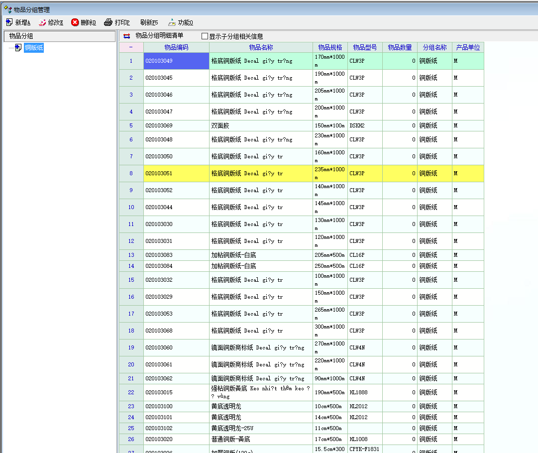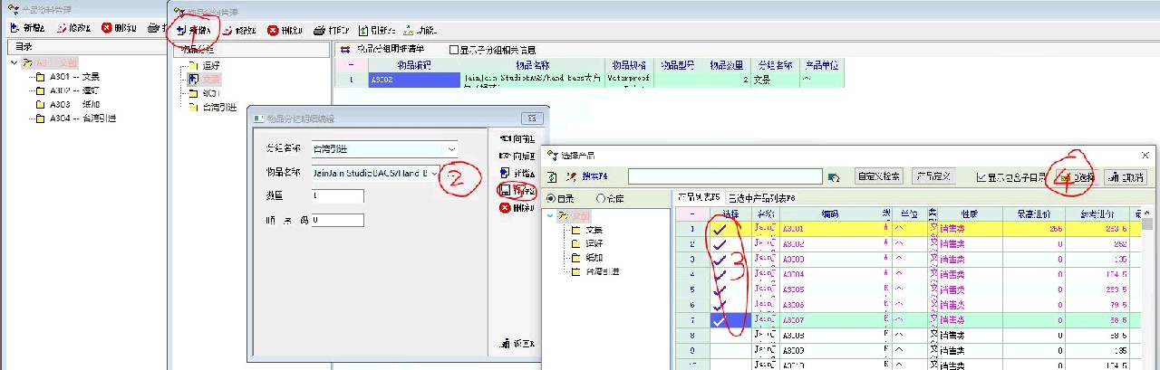2、在产品资料管理模块/更多功能/分组管理,我们进行分组管理/物品分组明细管理/点击物品名称后面的点,进行多品种选择添加时,可以批量选择,但是添加后还是只能添加一条记录,这样导致效率很低,数量多的情况下甚至无法使用该功能。