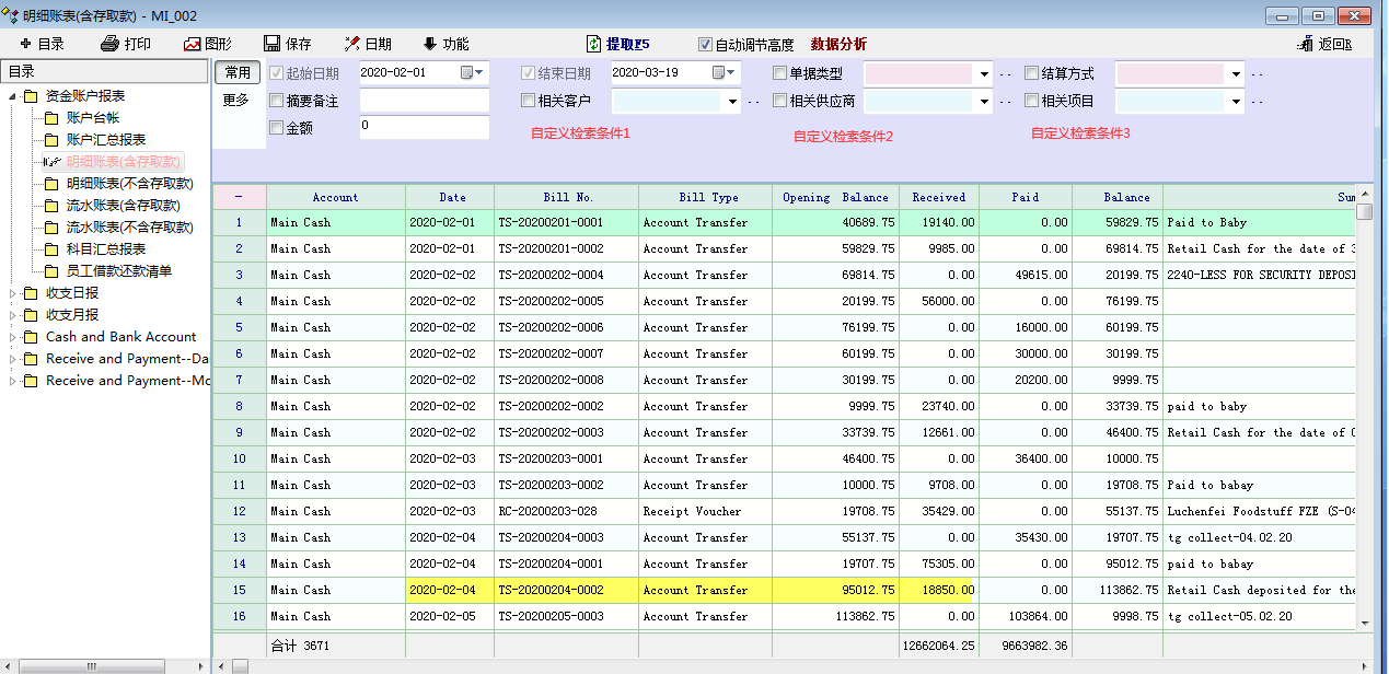 老师,软件预置报表能不能增加自定义查找条件,这里可以选择之后用脚本对已出结果进一步查找。例如,下面MI-02报表,经常要模糊查找支票号或者金额就特别方便。