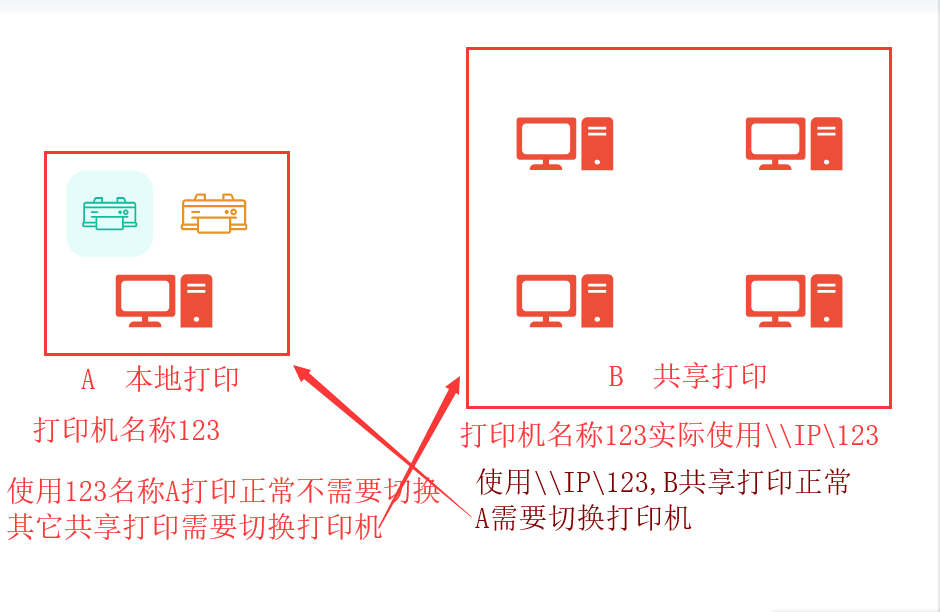 共享打印机 \\IP\打印机名 以这个名称 使用共享打印机的终端正常 连接打印机的电脑打印会报错需要切换 |