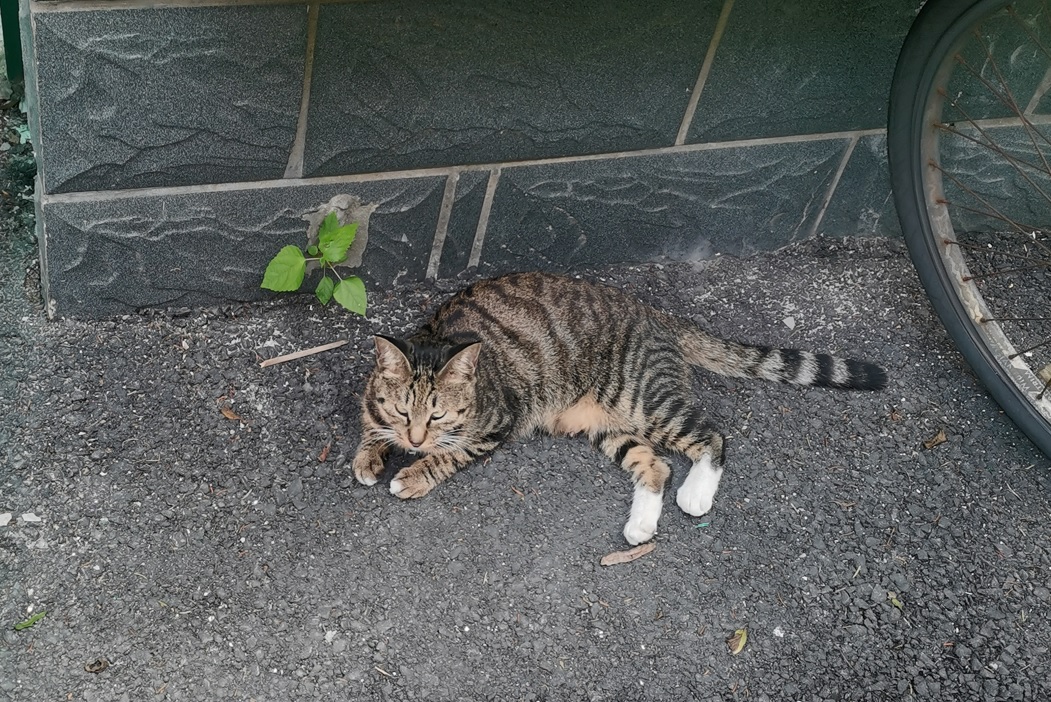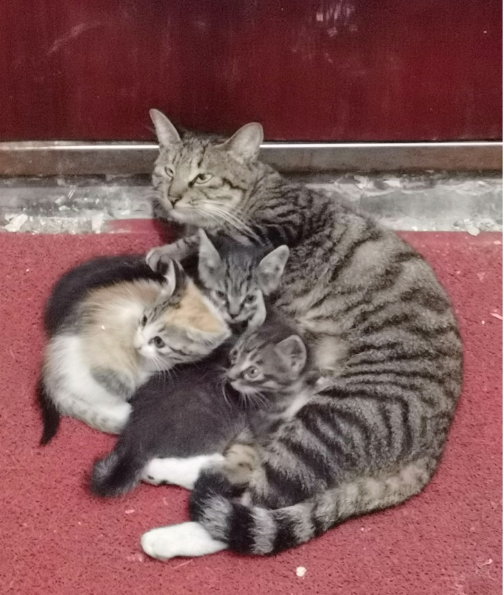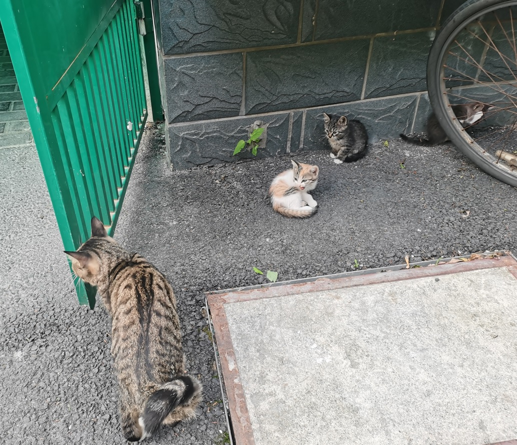 在我家门口的楼梯间,近来生活着一只野猫和她的三个孩子。