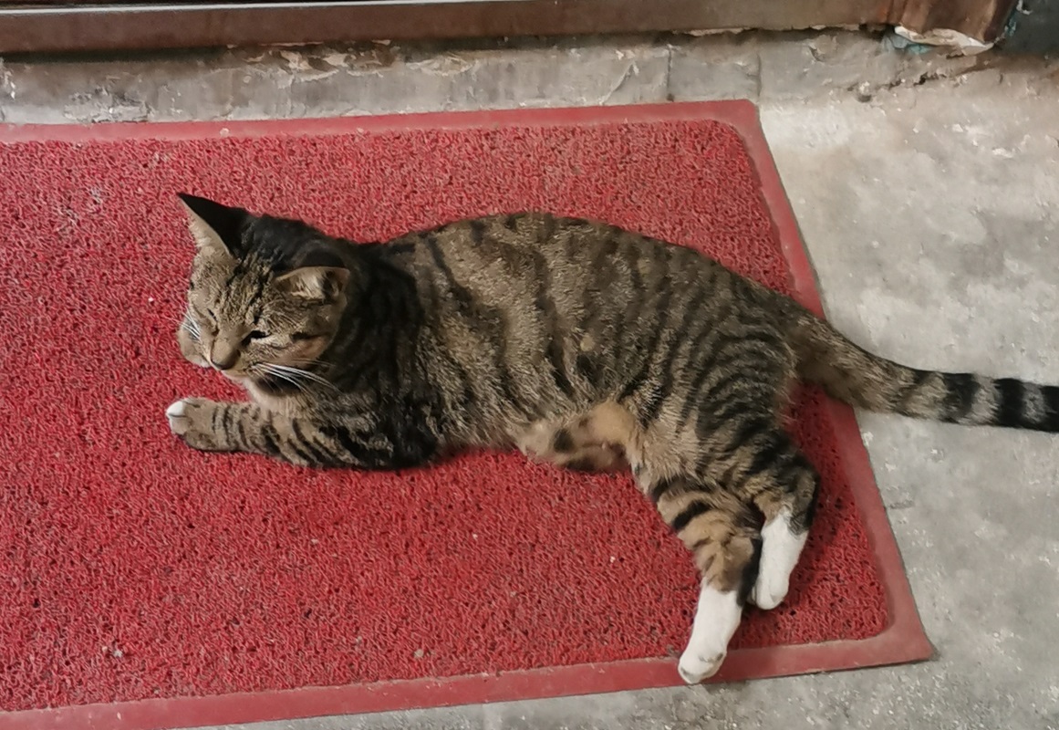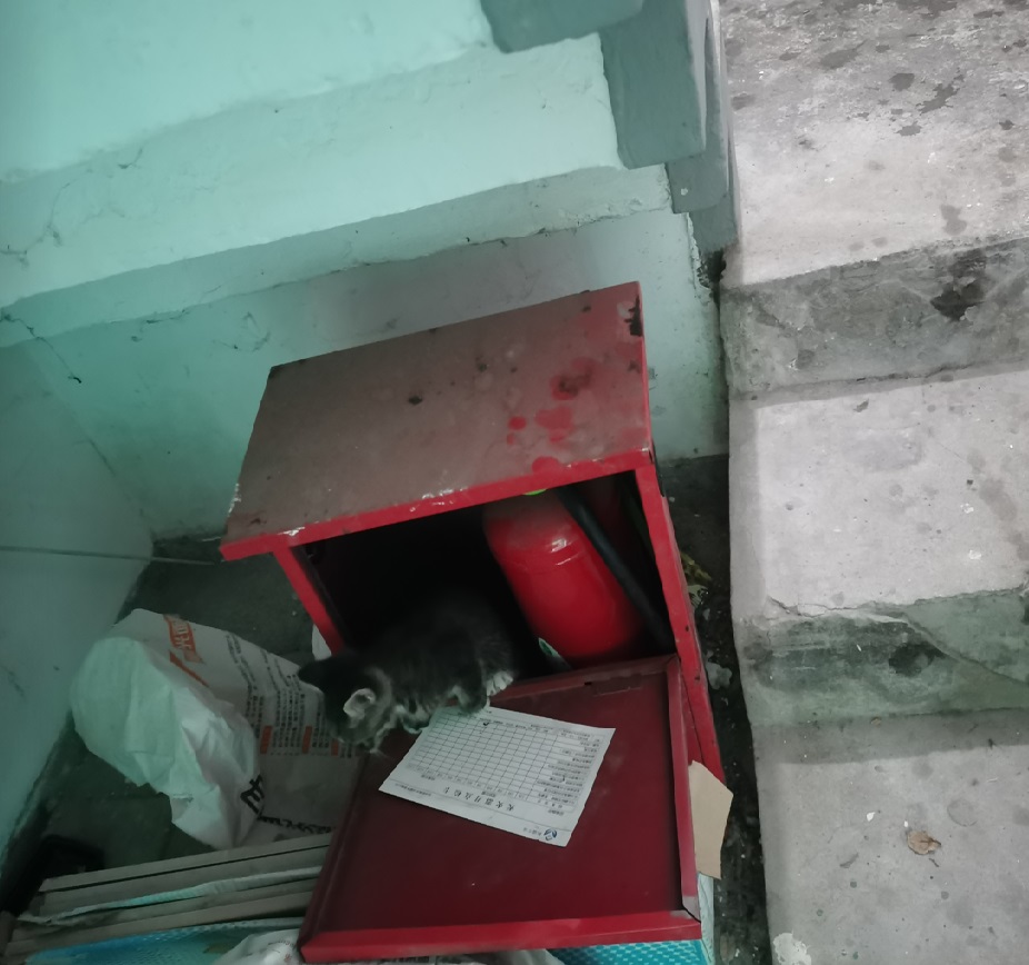 她们没有窝,小猫们晚上睡在装灭火器的铁盒子里,母猫睡在不远处的门口地垫上。
