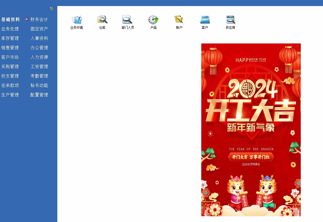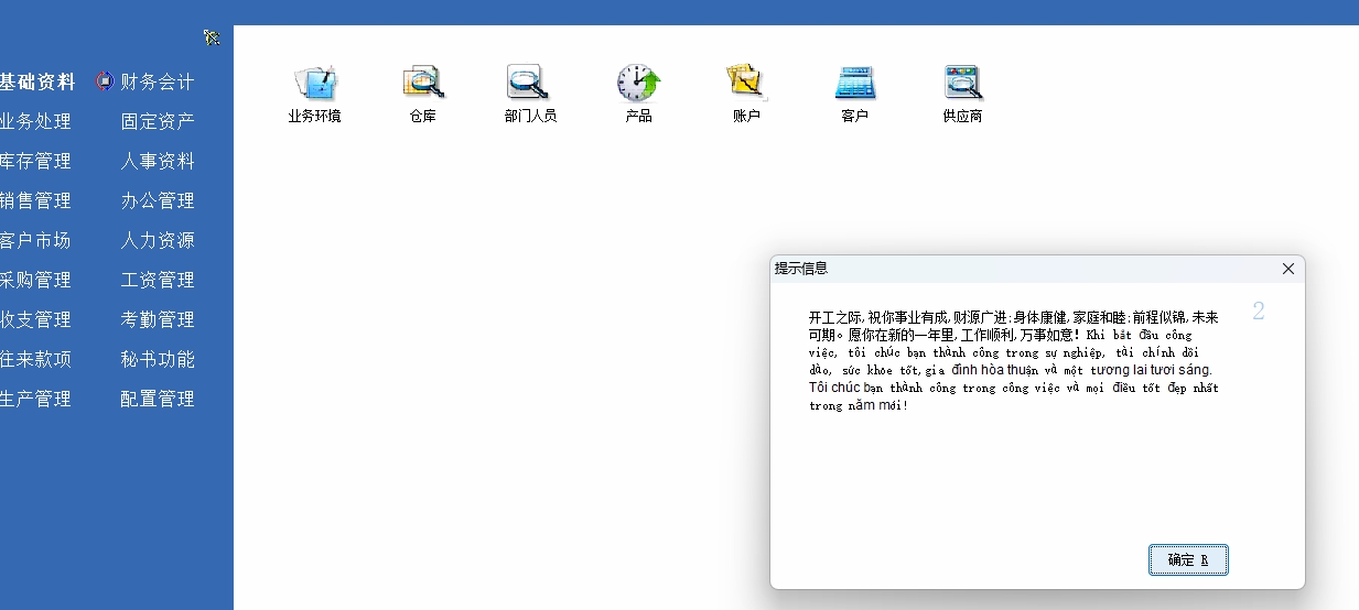 因系统不支持显示GIF格式图片,所以利用定时器函数可以做到图片轮播效果!也可以根据这个思路在每个单据添加图片式的新手指引,定时轮播展示或手动轮播都是可以的 1.在【秘书】菜单下的【文档管理】上传用来轮播的图片(例如新增了一个文档目录编号【CAAB】的文档目录) 2.在【导航窗口脚本定义】里面添加窗口最大化脚本 int main() { win_max() //最大化导航窗口 return 1; }; 3.在【主窗口脚本定义】里添加脚本 int timer1() { gui_hide('kgdj6') //隐藏第6张图片控件【多次轮播才需要隐藏最后一张图片控件】 string v_tp1; v_tp1 = get_edoc_file("CAAB","龙年大吉1.jpg"); //提取第1张图片,【CAAB】是存放轮播照片的文档目录编号,根据实际修改,【龙年大吉1.jpg】这是文档资料的资料名称 gui_create_image("ScrollBox_Base",'kgdj1',770,220,380,660,v_tp1) //创建第1张图片控件 timer_create('timer_hello2',1500,'main_win_open','timer2') //设置第2个定时器1.5秒后创建第2张图片的控件 timer_stop('timer_hello1'); //关闭第1个定时器 timer_start('timer_hello2'); //启动第2个定时器 return 1; }; int timer2() { gui_hide('kgdj1') //隐藏第1张图片控件 string v_tp1; v_tp1 = get_edoc_file("CAAB","龙年大吉2.jpg"); //提取第2张图片 gui_create_image("ScrollBox_Base",'kgdj2',610,270,660,380,v_tp1) //创建第2张图片控件 timer_create('timer_hello3',1500,'main_win_open','timer3') //设置第3个定时器1.5秒后创建第3张图片的控件 timer_stop('timer_hello2'); //关闭第2个定时器 timer_start('timer_hello3'); //启动第3个定时器 return 1; }; int timer3() { gui_hide('kgdj2') //隐藏第2张图片控件 string v_tp1; v_tp1 = get_edoc_file("CAAB","龙年大吉3.jpg"); //提取第3张图片 gui_create_image("ScrollBox_Base",'kgdj3',610,270,660,380,v_tp1) //创建第3张图片控件 timer_create('timer_hello4',1500,'main_win_open','timer4') //设置第4个定时器1.5秒后创建第4张图片的控件 timer_stop('timer_hello3'); //关闭第3个定时器 timer_start('timer_hello4'); //启动第4个定时器 return 1; }; int timer4() { gui_hide('kgdj3') //隐藏第3张图片控件 string v_tp1; v_tp1 = get_edoc_file("CAAB","龙年大吉4.jpg"); //提取第4张图片 gui_create_image("ScrollBox_Base",'kgdj4',610,270,660,380,v_tp1) //创建第4张图片控件 timer_create('timer_hello5',1500,'main_win_open','timer5') //设置第5个定时器1.5秒后创建第5张图片的控件 timer_stop('timer_hello4'); //关闭第4个定时器 timer_start('timer_hello5'); //启动第5个定时器 return 1; }; int timer5() { gui_hide('kgdj4') //隐藏第4张图片控件 string v_tp1; v_tp1 = get_edoc_file("CAAB","龙年大吉5.jpg"); //提取第5张图片 gui_create_image("ScrollBox_Base",'kgdj5',610,270,660,380,v_tp1) //创建第5张图片控件 timer_create('timer_hello6',1500,'main_win_open','timer6') //设置第6个定时器1.5秒后创建第6张图片的控件 timer_stop('timer_hello5'); //关闭第5个定时器 timer_start('timer_hello6');return 1; //启动第6个定时器 }; int timer6() { gui_hide('kgdj5') //隐藏第5张图片控件 string v_tp1; v_tp1 = get_edoc_file("CAAB","龙年大吉6.jpg"); //提取第6张图片 gui_create_image("ScrollBox_Base",'kgdj6',770,220,380,660,v_tp1) //创建第6张图片控件 timer_create('timer_hello1',1500,'main_win_open','timer1') //设置第1个定时器1.5秒后重新创建第1张图片的控件【需要多次轮播才设置】 timer_stop('timer_hello6'); //关闭第6个定时器 timer_start('timer_hello1'); //启动第1个定时器【需要多次轮播才启动】 return 1; }; int timer7() { gui_hide('kgdj1') //隐藏第1张图片控件 gui_hide('kgdj2') //隐藏第2张图片控件 gui_hide('kgdj3') //隐藏第3张图片控件 gui_hide('kgdj4') //隐藏第4张图片控件 gui_hide('kgdj5') //隐藏第5张图片控件 gui_hide('kgdj6') //隐藏第6张图片控件 timer_stop('timer_hello1'); //关闭第1个定时器 timer_stop('timer_hello2'); //关闭第2个定时器 timer_stop('timer_hello3'); //关闭第3个定时器 timer_stop('timer_hello4'); //关闭第4个定时器 timer_stop('timer_hello5'); //关闭第5个定时器 timer_stop('timer_hello6'); //关闭第6个定时器 string v_ywzfy,v_zwzfy; v_zwzfy ='开工之际,祝你事业有成,财源广进;身体康健,家庭和睦;前程似锦,未来可期。愿你在新的一年里,工作顺利,万事如意!' //中文祝福语 v_ywzfy = ' Khi bắt đầu công việc, tôi chúc bạn thành công trong sự nghiệp, tài chính dồi dào, sức khỏe tốt,' //越南文祝福语 v_ywzfy = v_ywzfy+'gia đình hòa thuận và một tương lai tươi sáng. Tôi chúc bạn thành công trong công việc và mọi điều tốt đẹp nhất trong năm mới!' //越南文祝福语拼接 voice_play(v_zwzfy); //语音播报中文祝福语 tip(v_zwzfy+v_ywzfy) //弹出中越文祝福语,3秒后自动关闭 timer_create('timer_hello7',1000,'main_win_open','timer7') //重新设置第7个定时器 timer_stop('timer_hello7'); //关闭第7个定时器,结束轮播 return 1; }; int main() { //在指定的日期:2024-2-19第一次登录才执行脚本 string dlrq,uid; dlrq = get_serv_date() //获取当前日期 uid = get_user_id() //获取登录账号 db_run("select count(*) from mup_login_log as a,mup_user p where a.login_time like '"+dlrq+"'+'%' and p.user_id = a.user_id and a.user_id in('"+ uid +"')") //提取当前日期登录账号的登陆次数 if(dlrq == '20240219' && db_res(0) == '1') //指定【2024-02-19】这天第一次登录才执行脚本 { timer_create('timer_hello1',3000,'main_win_open','timer1') //设置第1个定时器,3秒后创建第1张图片的控件【系统登录后到显示导航窗口有一个缓冲时间,增加了1.5秒,设置每个图片显示1.5秒】 timer_start('timer_hello1'); //启动第1个计时器 timer_create('timer_hello7',33000,'main_win_open','timer7') //设置
