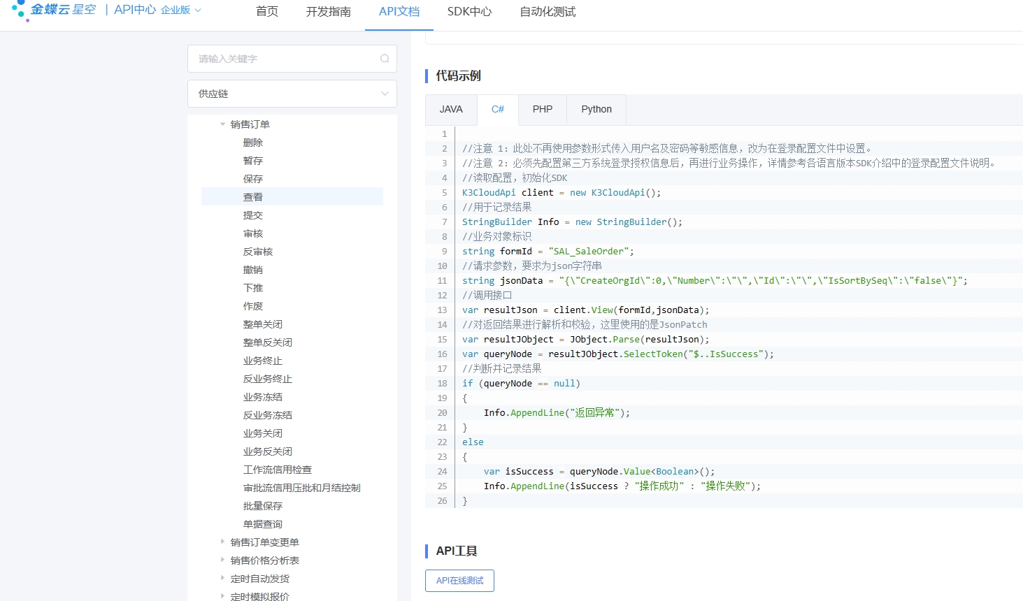 如,我要在oit里查询金蝶云星空公有云的数据:供应商/客户/单据 请问oit里,用csp脚本如何操作?谢谢 参考文档: https://openapi.open.kingdee.com/ApiDoc https://vip.kingdee.com/article/548833368948065536?productLineId=1 --------------------------------------------------------------------------------------------- Python: api_sdk = K3CloudApiSdk() api_sdk.Init(config_path='../conf.ini', config_node='config') # 请求参数 para = {"CreateOrgId":0,"Number":"","Id":"","IsSortBySeq":"false"} # 业务对象标识 formId = "SAL_SaleOrder" # 调用接口 response = api_sdk.View(formId, para) print("接口返回结果:" + response) # 对返回结果进行解析和校验 res = json.loads(response) if res["Result"]["ResponseStatus"]["IsSuccess"]: return True else: logging.error(res) return False |